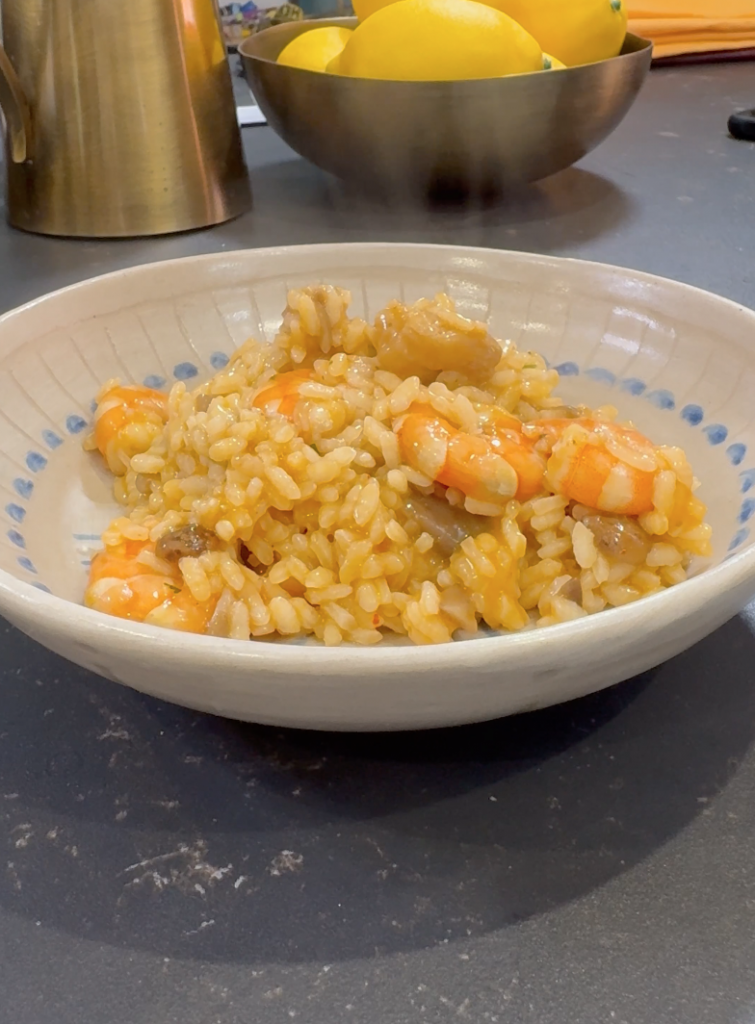 Si hay un plato que siempre triunfa en la mesa, ese es un buen arroz. Y cuando lo acompañamos con langostinos y setas, el resultado es un recetón de los que dejan huella. En esta versión, el secreto está en el fumet casero hecho con las cabezas y cáscaras de los langostinos, que concentra todo el sabor del mar y lo lleva directo al arroz.