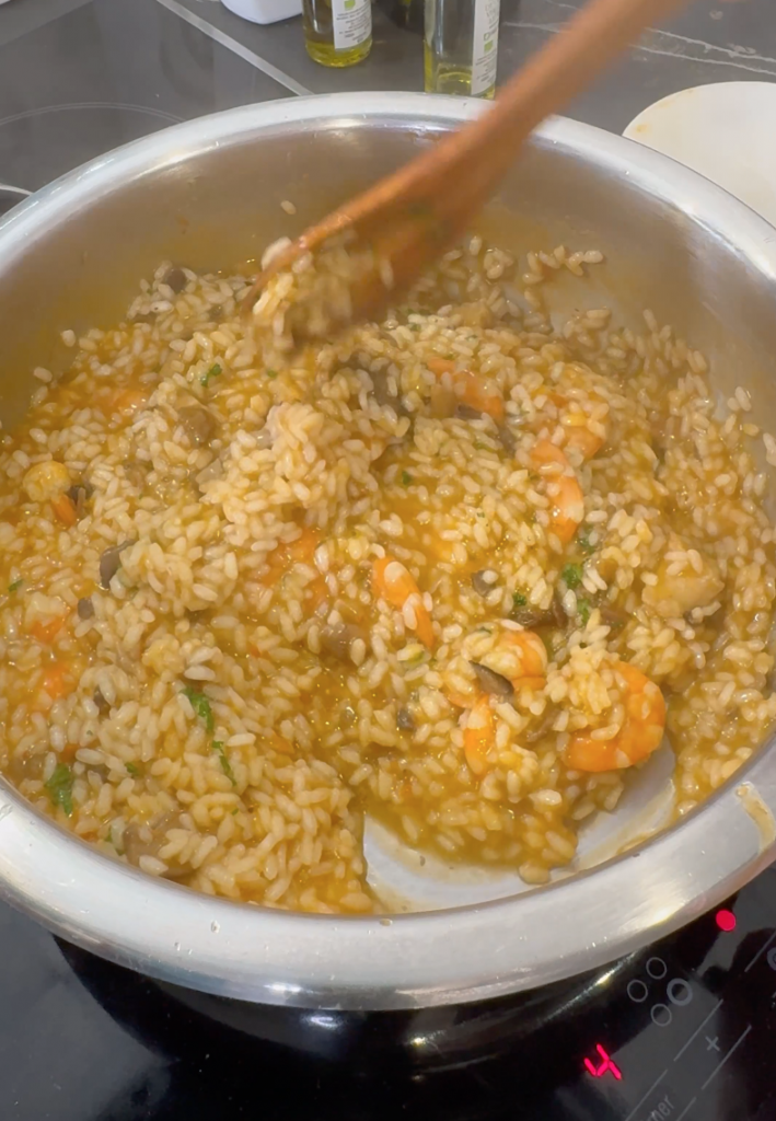 Un arroz meloso, con el grano en su punto y un sabor intenso que solo se consigue con un buen fumet casero. Los langostinos quedan jugosos, las setas aportan ese toque terroso que contrasta de maravilla con el sabor del mar, y el pimentón junto con el tomate redondean el conjunto.