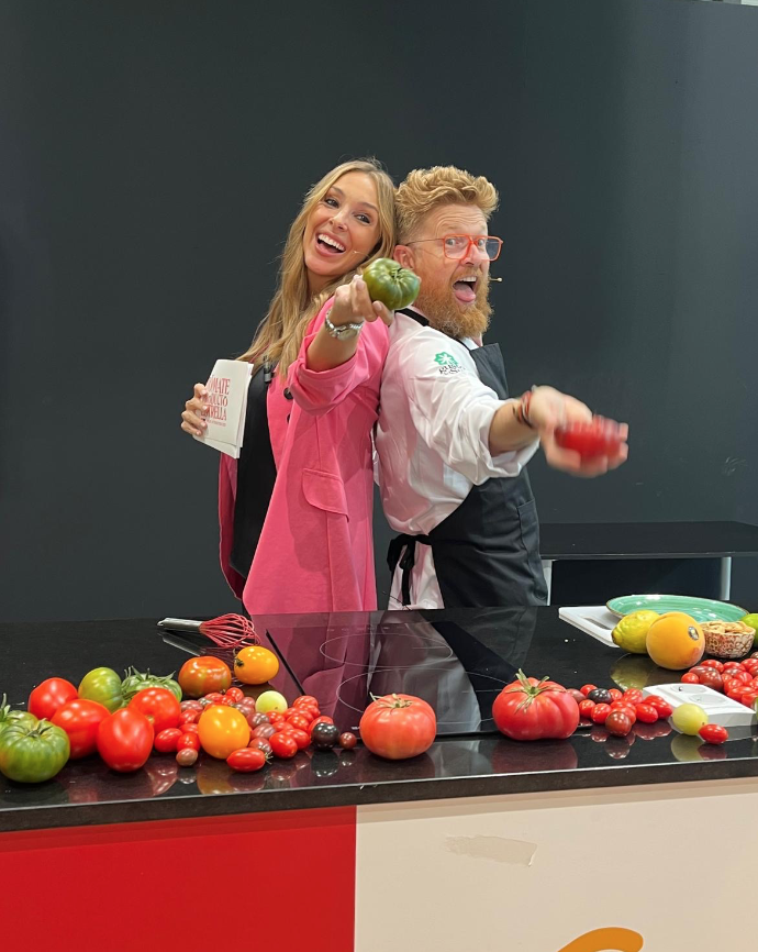 Además, participé en Factoría Chef, el espacio gastronómico de la feria, donde hicimos dos showcookings con el tomate como protagonista. Me acompañó Bea Solano a la presentación y juntos montamos un formato dinámico, cercano y participativo, muy de charla con el público. Factoría Chef volvió a ser el rincón donde la cocina explica el producto y el producto se luce en la cocina.